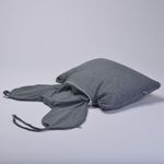 Possui zíper externo para a adaptação dos produtos e cordões de amarração para impedir o escorregamento da peça quando a mesma for utilizada como almofada de viagem.